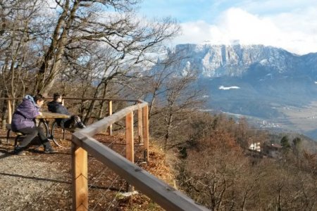 Aber nun machen wir uns weiter auf den Weg, wir spazieren die Promenade Nr. 37 entlang zurück nach Klobenstein. Der breite, gut begehbare Weg, der auch mit Kinderwagen leicht zu bewältigen ist, führt uns vorbei an einem kleinen Bunker bis hinauf zur sogenannten Aussichtskanzel, von der aus man die Dolomiten begutachten kann. Unter anderem sehen wir den mit weißen Schnee angezuckerten Lang- und Plattkofel, die Santnerspitze, den Schlern und natürlich den bekannten Rosengarten, der im richtigen Licht mit seinen wunderschönen Farben begeistert. Nach einer gemütlichen Rast über den Dächern von Klobenstein, gehen wir weiter und gelangen schließlich zum Bahnhof der Rittner Schmalspurbahn. Weiter geht’s zur Arena Ritten, wo sich Athleten aus aller Welt auf der schnellsten Freiluft- Eisschnelllaufbahn auf kommende Wettkämpfe vorbereiten. Und dann geht’s ab nach Hause auf den Moosbachhof, wo uns die heimelige Wärme des Bauernofens willkommen heißt und wir uns, bevor wir in den Stall müssen, noch mit einer gemütlichen Marende mit Speck, Schüttelbrot und Käse stärken.