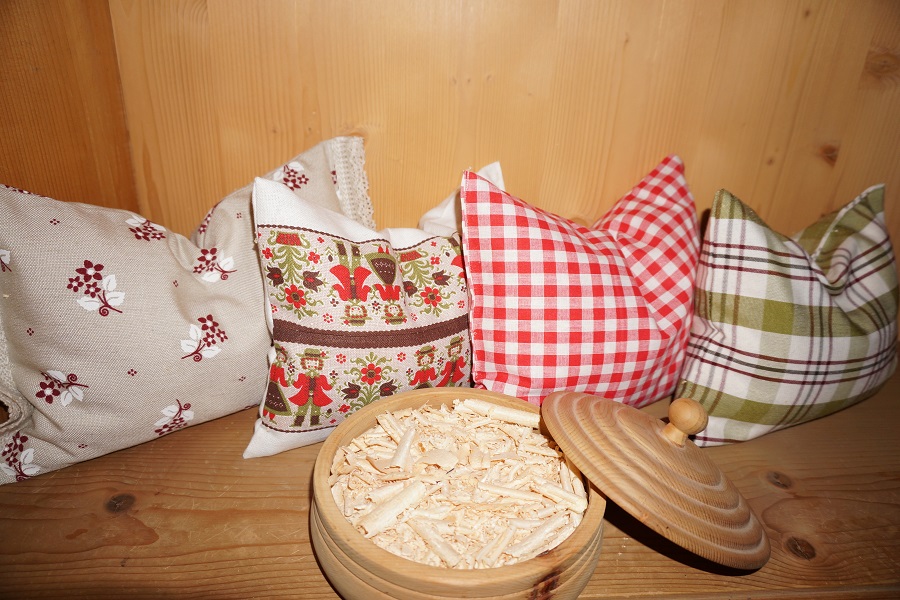 Auch unsere Bäuerin Margit näht für Sie sehr gerne Zirbenkissen befüllt mit reinen Zirbenflocken - so können Sie sich den Südtirolurlaub direkt mit nach Hause nehmen.